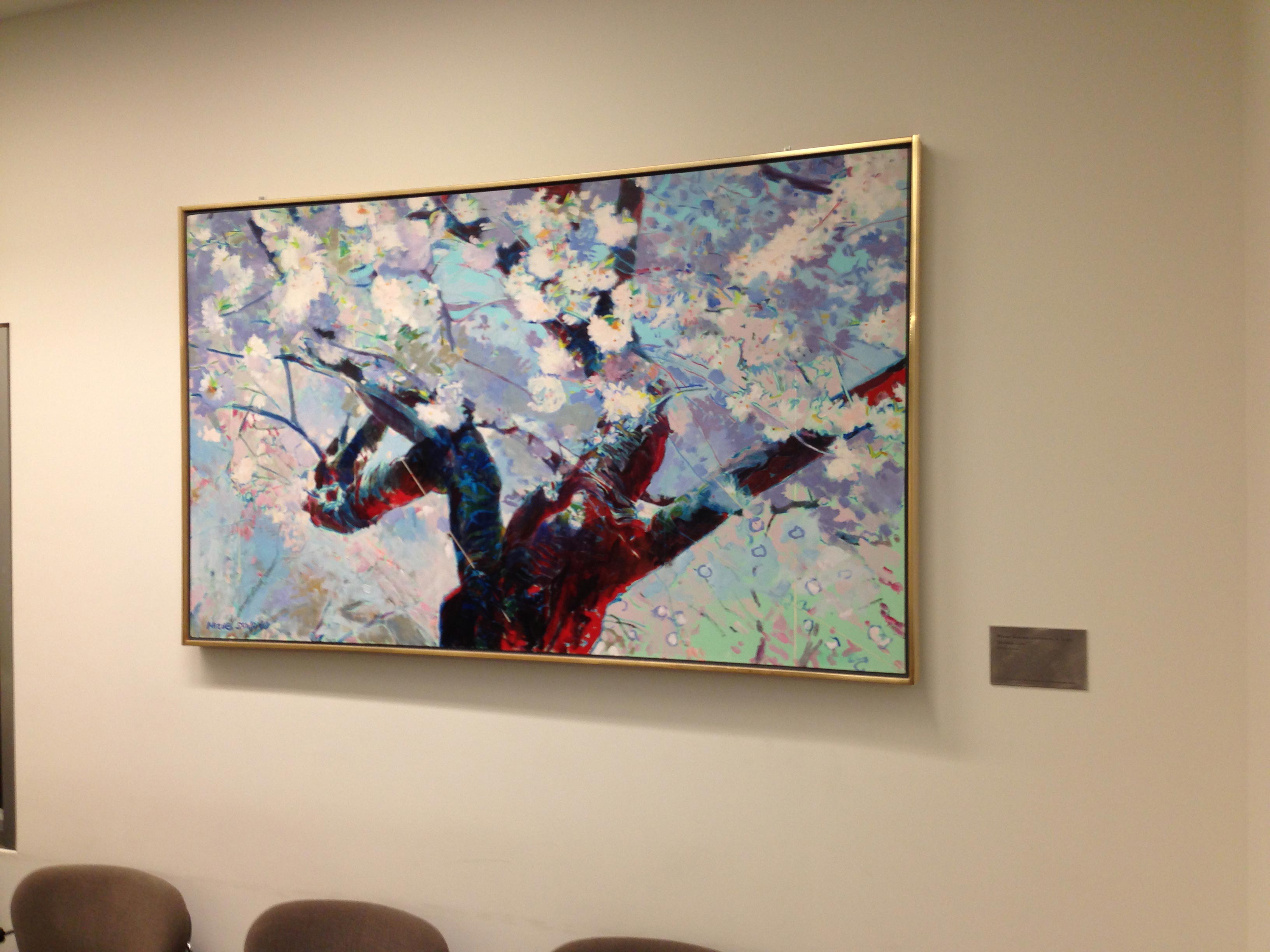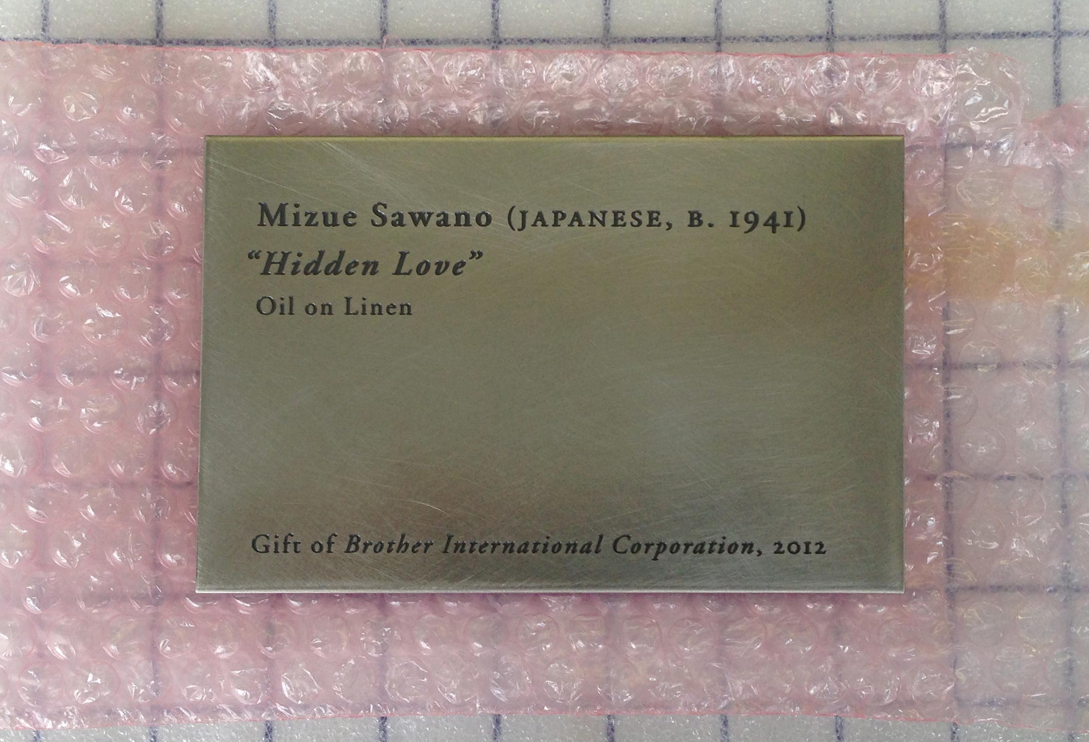 Artwork PlaqueThe etched and infilled stainless steel plaque sits alongside Mizue Sawano's painting in one of the Harvard CGIS conference rooms. The typesetting and styling are all original, and have defined the standard to be followed by new acquisitions. |